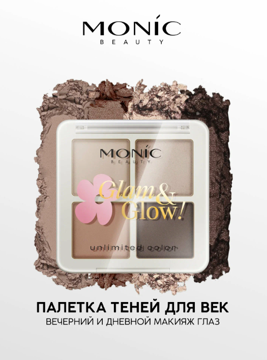 Тени для век Monic Beauty Glam&Glow! Unlimited All Day Color — это палетка из четырёх оттенков, каждый из которых обладает уникальным финишем. В палитре представлены как шиммерные, так и матовые оттенки, что позволяет создавать разнообразные образы: от естественных и спокойных до ярких и выразительных.