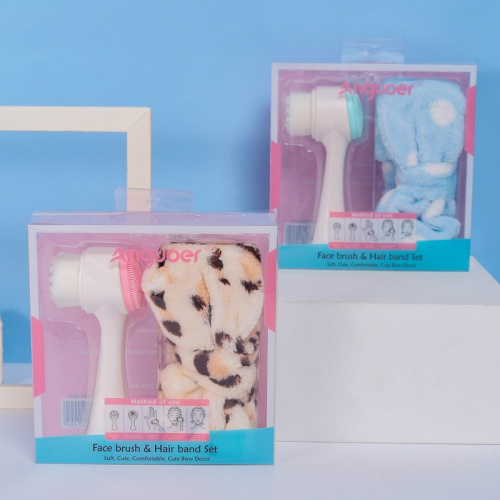 Набор 2-сторонняя массажная щеточка для умывания + повязка косметическая плюшевый бант (цвет случайный)