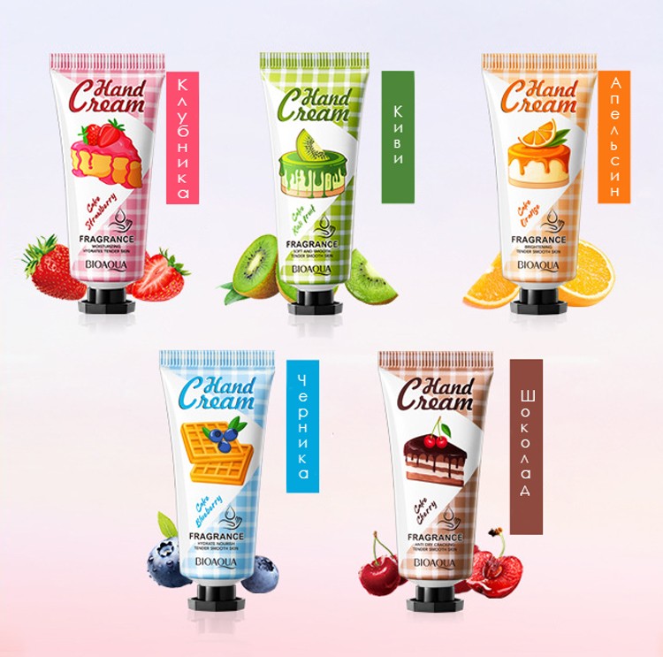 Увлажняющие и питательные ароматные крема для рук с фруктовыми экстрактами, глицерином и аллантоином.