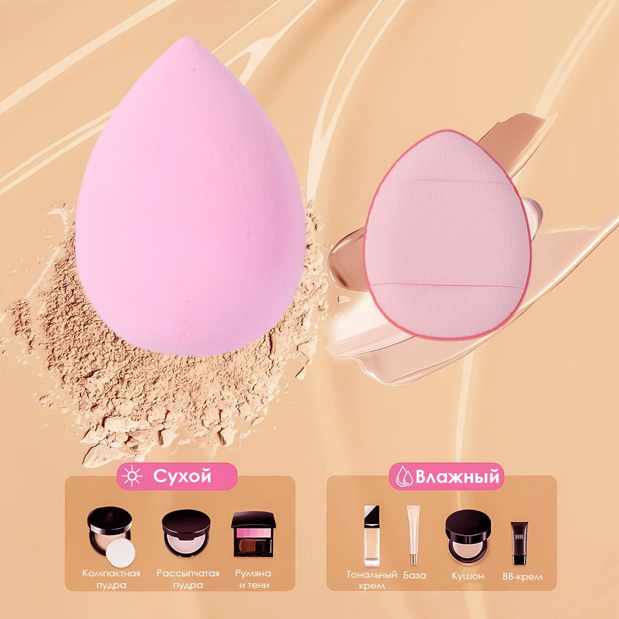 Специальный дизайн губок позволяет равномерно наносить макияж и точно работать в труднодоступных местах.