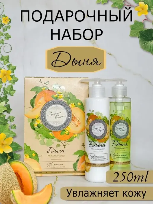 Подарочный набор дыня состоит из: жидкое мыло для рук дыня и крем-лосьон для рук дыня. Жидкое мыло, обогащенное экстрактами дыни, алое вера и пантенолом, бережно очищает и ухаживает за кожей рук, придает нежный аромат солнечной дыни. Быстро впитывающийся крем для рук увлажняет кожу, окутывает нежным ароматом солнечной дыни и дарит непревзойденный комфорт в течение всего дня.