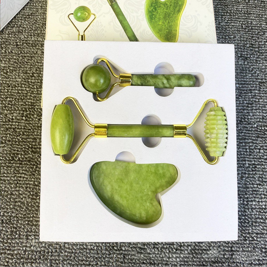 Высококачественный массажный набор с роллером и скребком Гуаша изготовлен из натурального нефрита.