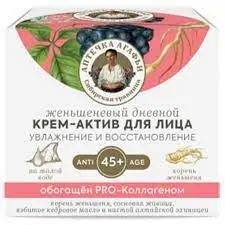 Объединив современные косметические разработки и традиционные рецепты сибирской травницы, мы создали для вас целебную серию «Аптечка Агафьи». Женьшеневый дневной крем-актив для лица на талой воде создан по старинным рецептам сибирской травницы Агафьи Тихоновны Ермаковой специально для борьбы с возрастными изменениями кожи. Он прекрасно питает, активизирует процессы регенерации в клетках, сокращает морщинки и делает контуры лица более чёткими.КОРЕНЬ ЖЕНЬШЕНЯ содержит рекордное количество антиоксидантов, наполняет клетки кожи энергией и силой, повышает упругость и тонус кожи. СОСНОВАЯ ЖИВИЦА чудодейственная смола, повышает эластичность кожи, выравнивает её тон, возвращает молодость и красоту.ВЗБИТОЕ КЕДРОВОЕ МАСЛО содержит ценные витамины, микроэлементы и жирные кислоты Омега 3-6, глубоко питает и смягчает.НАСТОЙ АЛТАЙСКОЙ ЭХИНАЦЕИ тонизирует и придаёт коже бархатистую гладкость и ухоженный вид.PRO-КОЛЛАГЕН – структурный белок, который является строительным материалом, он стабилизирует состояние эпидермиса, придаёт тканям эластичность и упругость. Не зря в косметологии его называют источником молодости. Aqua (талая вода) with infusions of Panax Ginseng Root Extract (экстракт корня женьшеня), Echinacea Purpurea Flower/Leaf/Stem Water (настой алтайской эхинацеи), Pinus Palustris Wood Tar (сосновая живица), Pinus Sibirica Seed Oil (взбитое кедровое масло), Caprylic/Capric Triglyceride, Dicaprylyl Ether, Glyceryl Stearate, Hydrogenated Starch Hydrolysate, Cetearyl Alcohol, Glycerin, Sodium Cetearyl Sulfate, Panthenol, Hydrolyzed Wheat Protein (растительный pro-коллаген), Biotin, Folic Acid, Cyanocobalamin, Niacinamide, Pantothenic Acid, Pyridoxine, Riboflavin (комплекс витаминов группы В), Caffeine (кофеин), Sodium PCA, Hydrolyzed Rice Bran Protein, Glycine Soja Protein (комплекс pro-эластин), Tocopherol (витамин Е), Sodium Ascorbyl Phosphate (витамин С), Sodium Citrate, Sodium Polyacrylate, Xanthan Gum, Citric Acid, Benzyl Alcohol, Ethylhexylglycerin, Parfum, Citronellols, Hexyl Cinnamal.