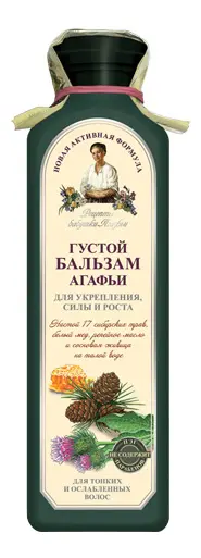Для укрепления и роста волос бренд «Рецепты бабушки Агафьи» создал органический бальзам-ополаскиватель на основе древних формул красоты и здоровья. Средство на основе талой воды, меда, натуральных масел и отвара 17 сибирских трав не только кондиционирует и смягчает локоны, но и укрепляет, восстанавливает их по всей длине. Входящие в состав репейное масло, сосновая живица и витамин P5 глубоко питают луковицы, предотвращая выпадение волос и активизируя их рост.