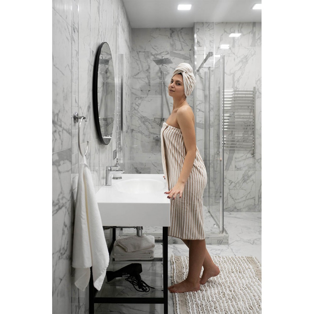 Использование: наклоните голову и оденьте тюрбан петлей вниз. Закрутите свободный конец вокруг своей оси, а затем заведите его назад и застегните пуговицу. Через 10-15 минут волосы окажутся слегка влажными, готовыми к укладке.