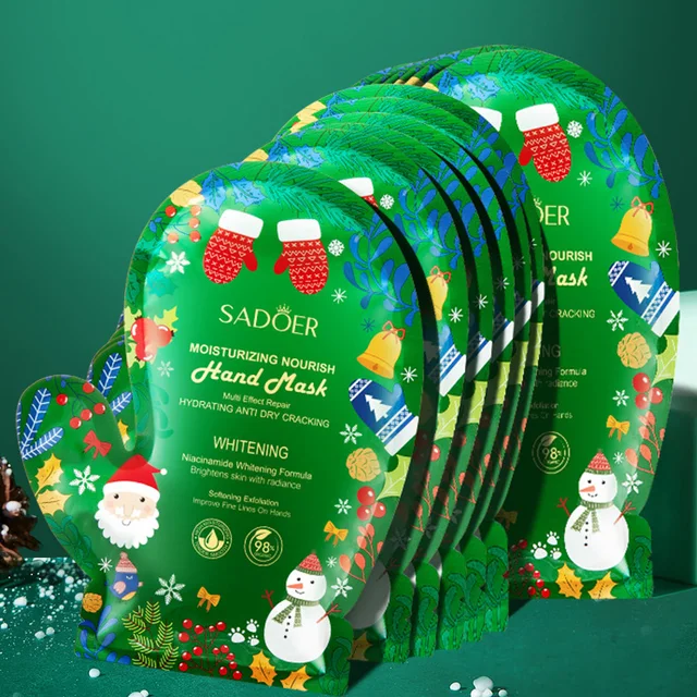 Нежная питательная маска для рук. Устраняет сухость и грубость кожи рук. Восстанавливает и увлажняет кожу, делает кожу нежной и гладкой. Смягчает нежную кожу рук, ухаживает и омолаживает. Делает ручки нежными, мягкими и гладкими. Маска для рук на рождественскую тематику удобно облегает руки, не только осветляет, увлажняет и питает кожу, но также может удалять старый кератин, осветляет мелкие морщинки на руках. Экстракты Алоэ, Центеллы, Гиалуроновая кислота и Ниацинамид предотвращают сухость и растрескивание кожи, эффективно улучшает сухую и грубую кожу рук, сделает ручки молодыми и красивыми. Оказывает быстрое восстанавливающее действие на уязвимую к повреждениям кожу рук. Уменьшает шелушение, ускоряет восстановление кожи, предотвращая сухость и трещинки.