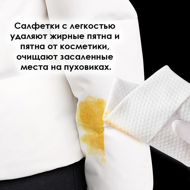 Чистящие салфетки для верхней одежд..показатьы с легкостью удаляют жирные пятна и пятна от косметики, очищают засаленные места на пуховиках, т.к. рукава, воротник, место застежки.Это простой и удобный способ поддерживать вашу одежду в отличном состоянии.