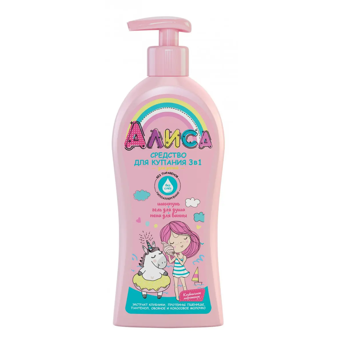 Алиса - это не просто косметика. Это история о дружбе задорной, мечтательной девочки Алисы и ее волшебного друга - белого единорога Мартина. На каждом средстве изображены яркие моменты их веселых игр, которые не оставят равнодушной ни одну маленькую мечтательницу. Кроме красочной и оригинальной упаковки специалисты АО "Свобода" позаботились и о пользе и безопасности косметических средств новой серии. Продукты серии "Алиса" сделаны на базе компонентов натурального растительного происхождения - это экстракты клубники, протеины пшеницы, пантенол, овсяное, кокосовое молочко и многое другое. Все новинки обладают приятными фруктовыми ароматами, а главное - все изделия прошли официальные клинические испытания у дерматологов, гипоаллергенны, не содержат красителей и парабенов, не вызывают слёз и обладают нейтральным уровнем pH. Средство для купания 3 в 1 заменяющий сразу шампунь, гель для душа и пену для ванны.