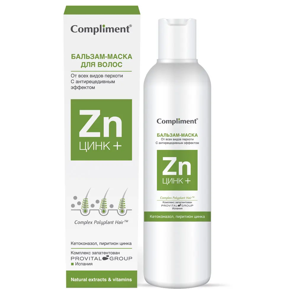 Максимальный результат достигается только при комплексном использовании средств: Бальзам-Маска совместно с Шампунем серии «ЦИНК+» Compliment® и Активный несмываемый комплекс двойного действия в ампулах этой же серии (рекомендуется наносить