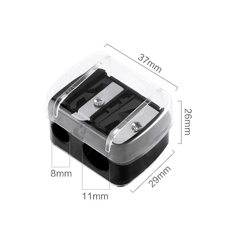 Универсальная точилка для косметических карандашей с 2 отверстиями разного диаметра (8 мм. и 12 мм.) с полупрозрачным колпачком и прочным стиком для очистки лезвий.