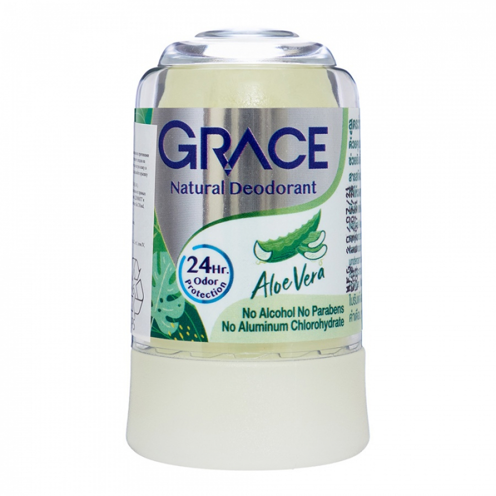 Дезодорант кристаллический Алоэ Вера Грейс 50гр. Grace Crystal Aloe Vera. Кристаллический дезодорант принято считать абсолютно безопасным средством в части защиты от запаха пота. В отличие от обычных дезодорантов, он не содержит сушащего кожу спирта и вредных для здоровья парабенов, на 99,8% состоит из квасцов аммония, воды и экстракта Алоэ Вера. Кристаллический дезодорант считается великолепным антисептиком, деликатно ухаживает за кожей, не забивая поры и не провоцируя аллергических реакций. Применение: смочить его поверхность водой и использовать как обычный дезодорант. Состав: вода, отдушка, алоэ вера экстракт, квасцы.