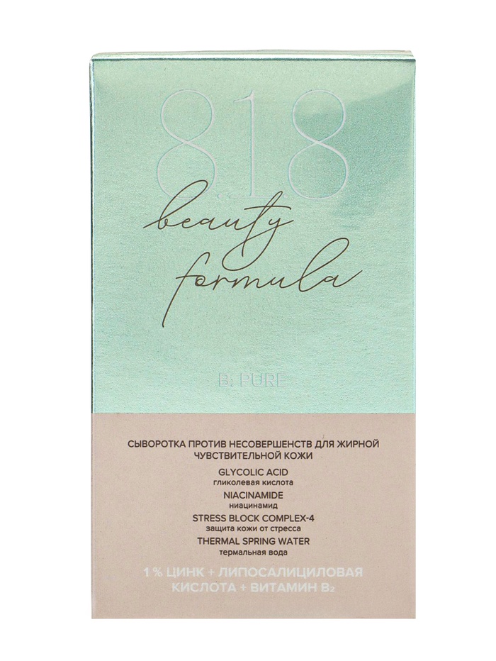 Сыворотка 818 beauty formula создана для целенаправленного ухода за жирной и чувствительной кожей, склонной к высыпаниям и воспалениям. Лёгкая текстура быстро впитывается, не утяжеляя кожу, и помогает бороться с несовершенствами, сохраняя баланс увлажнённости.