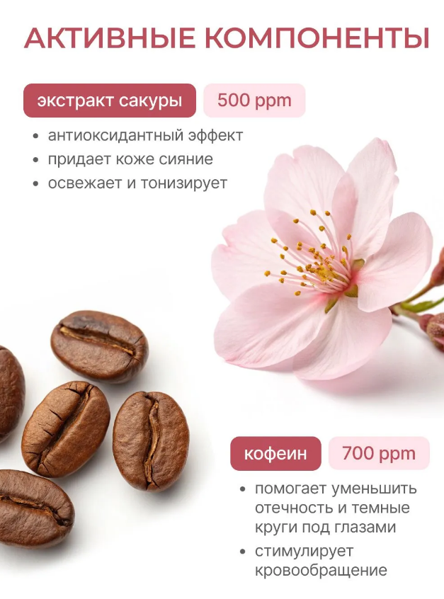 Крем обеспечивает комплексный уход за кожей вокруг глаз. Экстракт сакуры оказывает антиоксидантный эффект и деликатно подсвечивает зону вокруг глаз. Кофеин помогает уменьшить отечность и темные круги под глазами. Масло ши и муцин улитки питают и смягчают кожу. Пантенол и церамиды снимают раздражение и восстанавливают защитный барьер. Глутатион помогает уменьшить пигментацию и выравнивает тон кожи. Кожа вокруг глаз выглядит свежей, отдохнувшей и сияющей. Сохраняйте упаковку – на ней содержится важная информация.