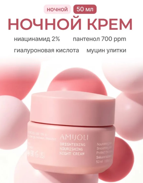 AMIJOLI Brightening Nourishing Night Cream Sakura Radiance Ночной питательный крем для лица с экстрактом сакуры и транексамовой кислотой для выравнивания тона кожи 50мл