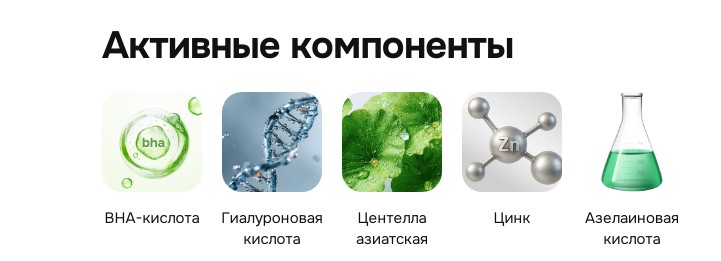 Азелаиновая кислота (10%) обладает антибактериальным свойством, предотвращает появление комедонов. Замедляет процесс образования пигментных пятен, рост бактерий и минимизирует риск появления акне.
