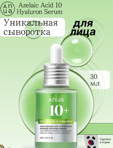Сыворотка с азелаиновой кислотой Anua Azelaic Acid 10 Hyaluron Redness Soothing Serum успокаивает, уменьшает красноту и сокращает выраженность сосудистой сетки. Продукт укрепляет стенки капилляров, снижает проницаемость кожи и уплотняет ткани. Снимает зуд и раздражение, не провоцирует сухости.