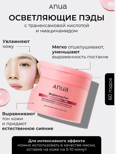 Осветляющие пэды с транексамовой кислотой Anua Niacinamide 5 TXA Brightening Pad эффективно выравнивают тон кожи и придают ей естественное сияние. Помогают уменьшить пигментацию и следы постакне, устраняют тусклый землистый оттенок.