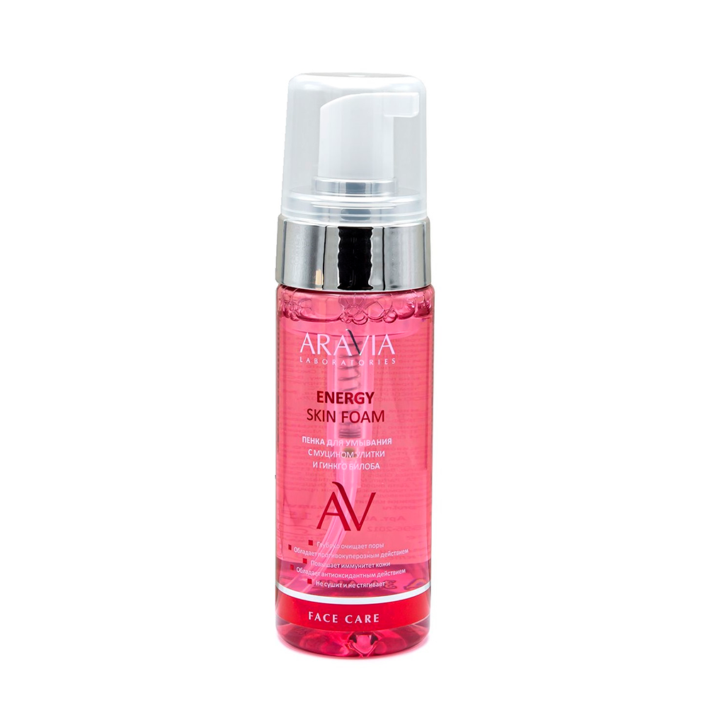 ARAVIA ( АРАВИЯ ) Пенка для умывания мягко и эффективно очищает кожу от загрязнений и себума, глубоко очищает поры. Муцин улитки глубоко увлажняет и питает кожу, оказывает мощный антиоксидантный эффект, предотвращая разрушение клеток эпидермиса свободными радикалами. Экстракт гинкго билоба идеально справляется с проблемами кожи жителей мегаполисов, наполняя ее энергией, нейтрализует окислительные процессы в коже, повышает ее иммунитет в условиях загрязненного воздуха и перепадов температур. Обладает противокуперозным действием. Благодаря нежной формуле не сушит и не стягивает кожу. Подходит для всех типов кожи.