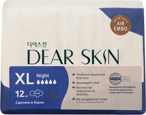 Гигиенические прокладки Dear Skin созданы с заботой о вашей коже. Позволяют ей дышать благодаря специальной волнистой поверхности Air Embo, с которой вы забудете про раздражения! Тройные бортики надёжно защищают от протекания: комфортно даже во время физической активности! Продукт прошел тестирование по немецкой системе Dermatest с оценкой "Отлично". Длина прокладки 33 см. Идеально подходит для защиты в ночное времени суток и после родов.