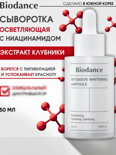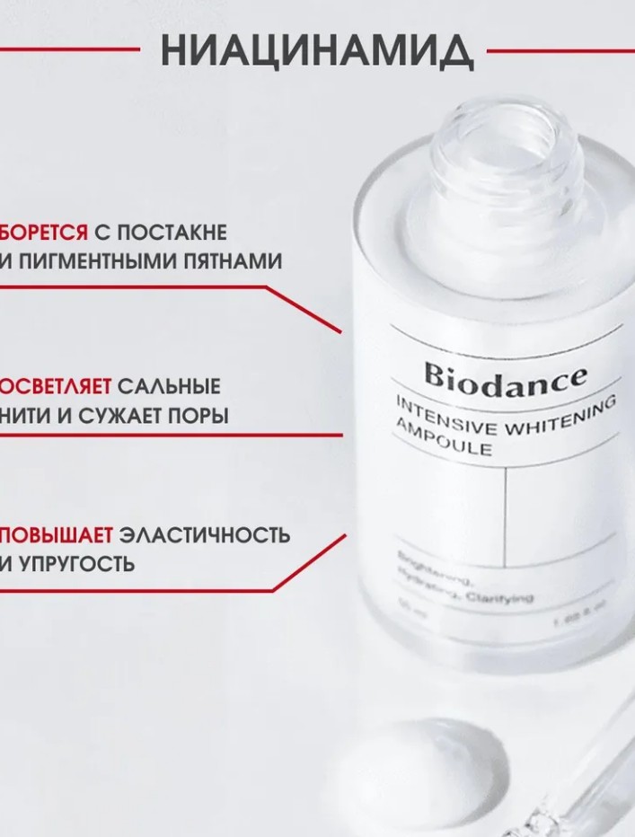Интенсивная осветляющая ампульная сыворотка с ниацинамидом направлена на активное выравнивание тона кожи и работу с гиперпигментацией.
