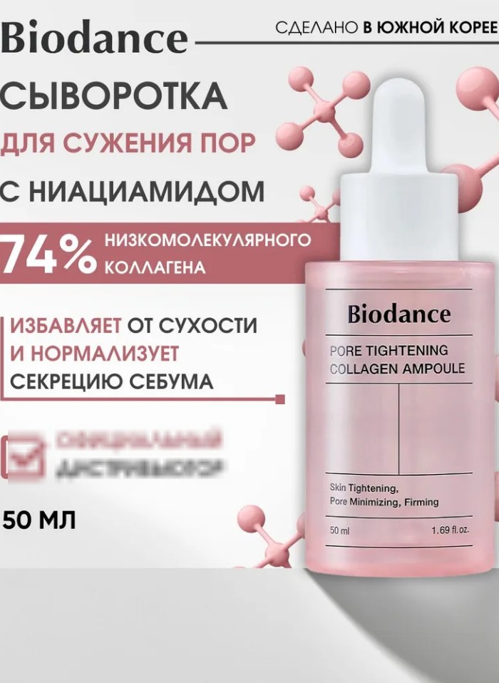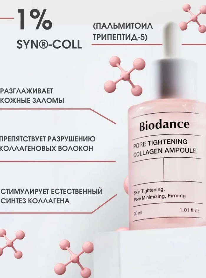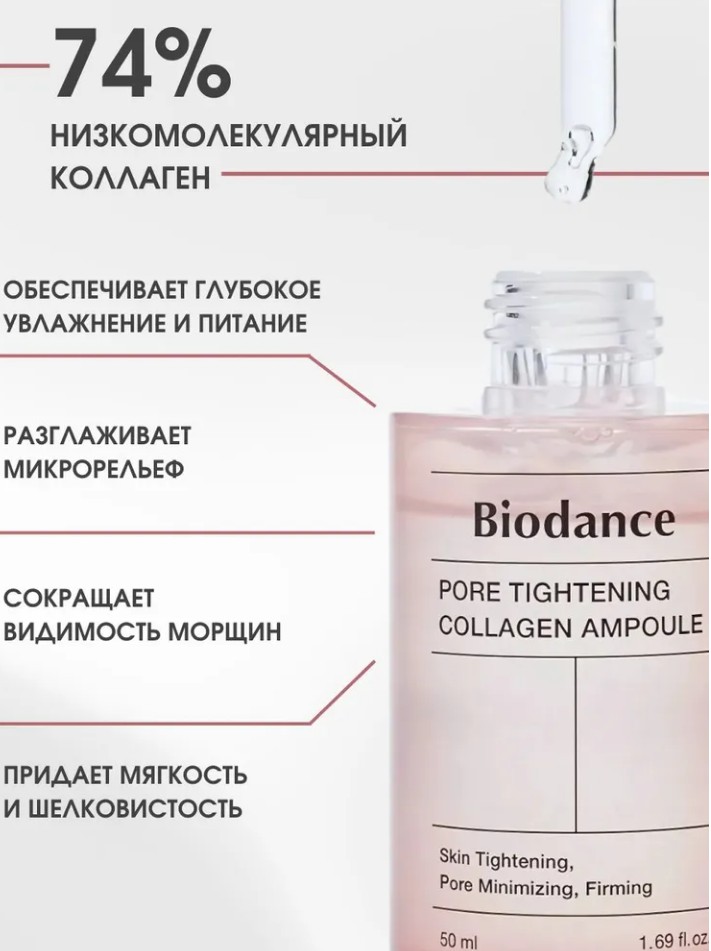 Ампульная сыворотка для сужения пор с коллагеном обеспечивает гладкость рельефа и поддержание упругости кожи.