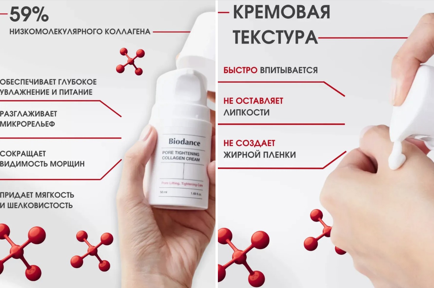 Низкомолекулярный коллаген 59% — способен проникать в глубокие слои, обеспечивая пролонгированное и глубокое увлажнение и питание изнутри, замедляет естественный процесс старения, разглаживает микрорельеф, сокращая видимость морщин, а также придает мягкость и шелковистость.