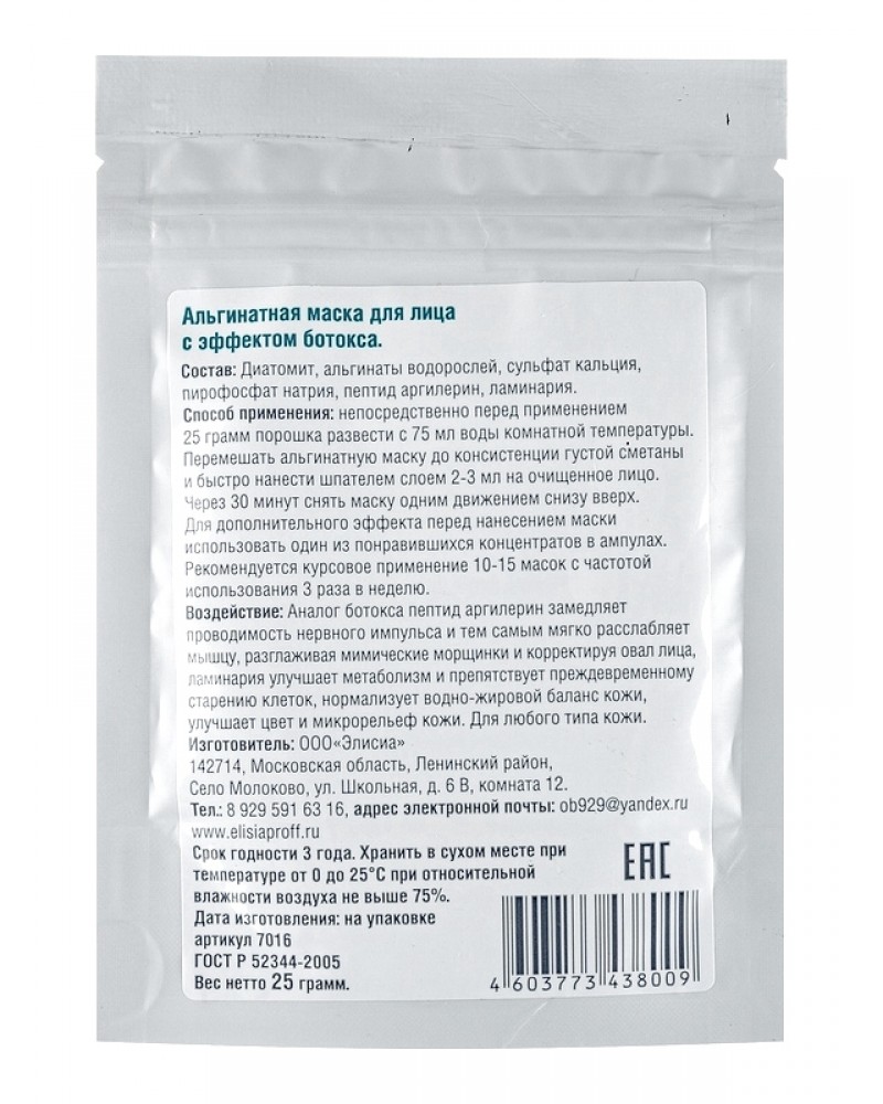 Альгинатная маска для лица с эффектом ботокса в своем составе имеет пептид аргилерин-аналог ботокса,который замедляет проводимость нервного импульса и тем самым мягко расслабляет мышцу ,разглаживая мимические морщины и корректирует овал лица.Ламинария улучшает метаболизм и препятствует преждевременному старению клеток,нормализует водно-жировой баланс кожи,улучает цвет и микрорельеф.Подходит для любого типа кожи .