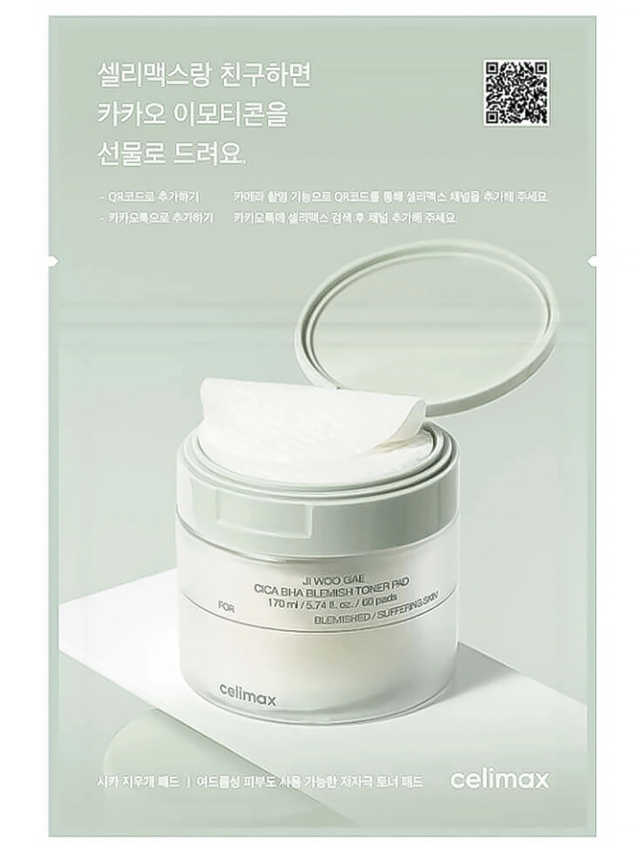 Celimax Успокаивающие тонер-пэды с кислотами и центеллой азиатской Ji Woo Gae Cica BHA Blemish Toner Pad 10 шт