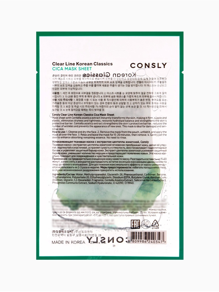 Тканевая маска Consly с экстрактом центеллы азиатской разработана для ухода за повреждённой, чувствительной и склонной к раздражению кожей. Экстракт центеллы (CICA) — это ценное успокаивающее и восстанавливающее средство, которое помогает укрепить защитный барьер кожи, снизить покраснение и устранить сухость и стянутость после воздействия внешних факторов. Такой компонент часто используют в продуктах для деликатного ухода именно за чувствительной кожей, поскольку он улучшает гидролипидный баланс и поддерживает процессы регенерации эпидермиса.