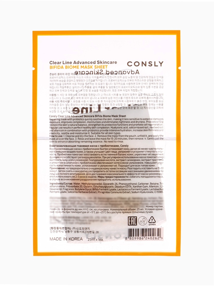 Тканевая маска Consly «С пробиотиками» представляет собой средство для восстановления и укрепления кожи лица, направленное на улучшение её общего состояния, усиление защитных функций и снятие раздражения. Маска подходит для всех типов кожи, включая ту, которая может быть чувствительной к внешним стресс‑факторам. Пробиотические компоненты в составе помогают поддерживать естественный микробиом кожи — это способствует уменьшению чувствительности, укреплению кожного барьера и улучшению способности кожи противостоять негативному воздействию окружающей среды. Пробиотики также участвуют в регуляции микрофлоры, что может способствовать более ровному тону и уменьшению сухости.