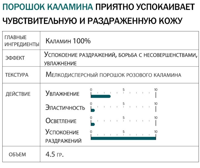 Сухой концентрат каламина бережно ухаживает за кожей, не вызывая раздражения или аллергических реакций. Отличается нежной текстурой, не царапает кожу, хорошо растворяется в любых косметических средствах. Его можно добавлять в тоники, сыворотки, кремы, маски. Он повышает их эффективность, дополнительно оказывая лечебный эффект.