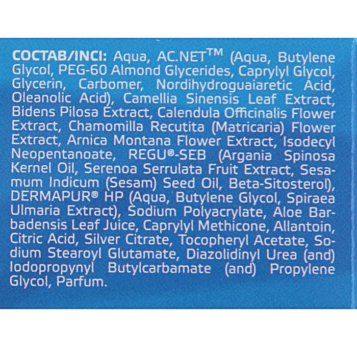 Состав: AC.NET, экстракты зелёного чая, череды, календулы, ромашки, арники, Regu-seb (масло аргании, экстракты плодов карликовой пальмы и кунжутного семени), экстракт таволги вязолистной, гель алоэ вера, аллантоин, лимонная кислота, цитрат серебра, витамин Е.