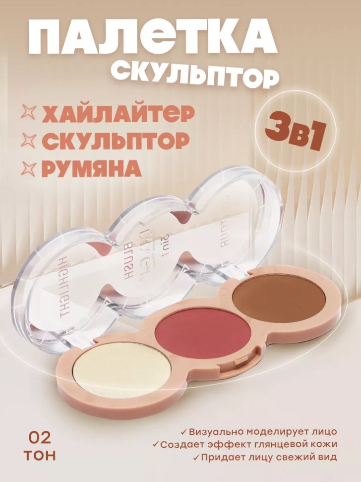 Хайлайтер, румяна, контуринг для лица – эти три волшебных продукта собраны в одной компактной палетке, что делает вашу косметичку легче и компактнее. Теперь вы сможете быстро и легко освежить свой образ в любой момент. Хайлайтер подарит вашей коже невероятное сияние, вы будете излучать внутренний свет, будто только что вернулись с отдыха на тропическом острове. Румяна для лица – придадут вашим щечкам нежный и естественный румянец, словно после прогулки на свежем воздухе. Ваш образ становится живым и невероятно привлекательным. Скульптор для лица - секрет идеального контуринга! Скульптор создает магические акценты на вашем лице, придавая утонченность. Вы сможете выделить скулы, создать контуринг носа, подчеркнуть подбородок, создать совершенные контуры для завершенного макияжа.​