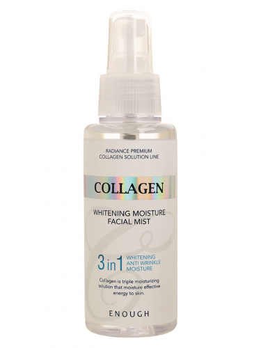Изготовитель: Enough Co.Ltd., КОРЕЯ, РЕСПУБЛИКА, 6, Dangsan-ro 135beon-gil, Gunpo-si, Gyeonggi-do. Осветляющий мист Enough W Collagen Whitening Moisture Facial Mist мгновенно увлажняет и освежает кожу лица, устраняя внешние следы усталости на лице. Создает защитный слой, препятствующий потере влаги. Спрей можно использовать как до нанесения макияжа, так и после его завершения для закрепления макияжа или устранения ощущения сухости и стянутости кожи в течение дня. Способ применения: Закрыть глаза и распылить мист с расстояния 20 см, мягкими похлопывающими движениями помочь средству впитаться.