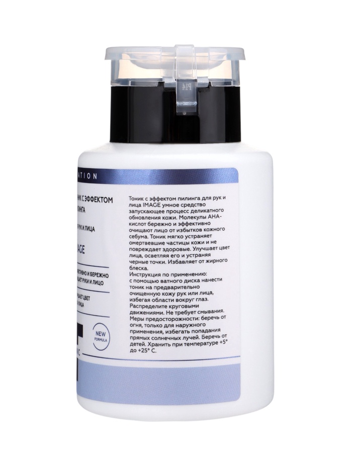 ESTELICA PROFESSIONAL Тоник с эффектом пилинга для рук и лица IMAGE — инновационное средство для бережного обновления кожи. Молекулы AHA-кислот мягко отшелушивают омертвевшие клетки, удаляют избыток себума, устраняют черные точки и жирный блеск, при этом не повреждая здоровые участки кожи. Тоник улучшает цвет лица, делает кожу более свежей и гладкой. Подходит для всех возрастов и типов кожи.