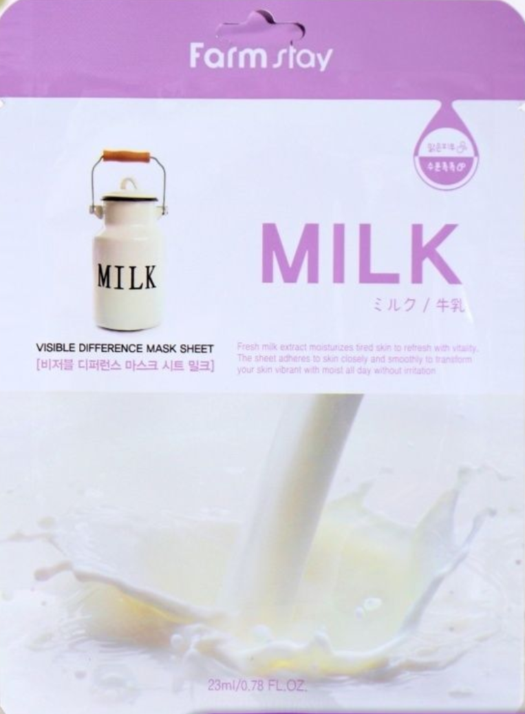 Тканевая маска с молоком FarmStay Visible Difference Milk Mask Sheet питает и увлажняет, смягчает, способствует восстановлению гидр липидного баланса, предохраняет кожу от обезвоживания, замедляет процессы старения кожи, осветляет пигментацию и веснушки, улучшает тон и структуру кожи, возвращая сияние и здоровый вид.