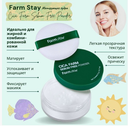 Матирующая рассыпчатая пудра с центеллой азиатской FarmStay Cica Farm Sebum Free Powder маскирует несовершенства, делает кожу шелковистой, гладкой и матовой. У пудры легкая, прозрачная текстура, которая не сушит эпидермис и не закупоривает поры.