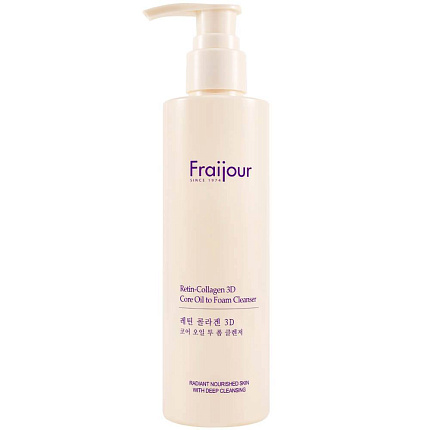 Retin-Collagen 3D Core Oil to Foam Cleanser, Гидрофильное масло для лица ТМ Fraijour. Гибридное очищающее средство 2 в 1 для снятия макияжа и глубокого очищения. Эффективно удаляет загрязнения с кожи и одновременно обеспечивает увлажнение и питание благодаря формуле на основе масла, 7-ми видов коллагена и 9-ти видов пептидов. При контакте с водой превращается в пенку, которая легко смывается, оставляя кожу чистой, мягкой и увлажненной.