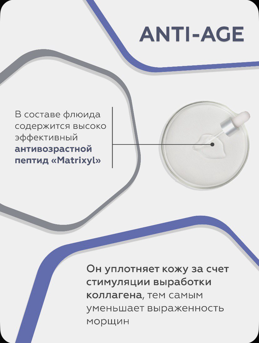 Флюид предотвращает врастание волос и появление воспалений, выравнивает тон кожи, снимая отечность и уменьшая выраженность купероза, помогает от раздражения после бритья. Сквалан и бисаболол эффективно смягчают и увлажняют кожу, укрепляют защитный барьер кожи и нейтрализуют воспаления. Растительные экстракты заживляют микроповреждения и успокаивают раздраженную кожу, снимают покраснение, оказывают противовоспалительное действие. Антивозрастной пептид "Matrixyl" уплотняет кожу за счет стимуляции выработки коллагена, тем самым уменьшает выраженность морщин.