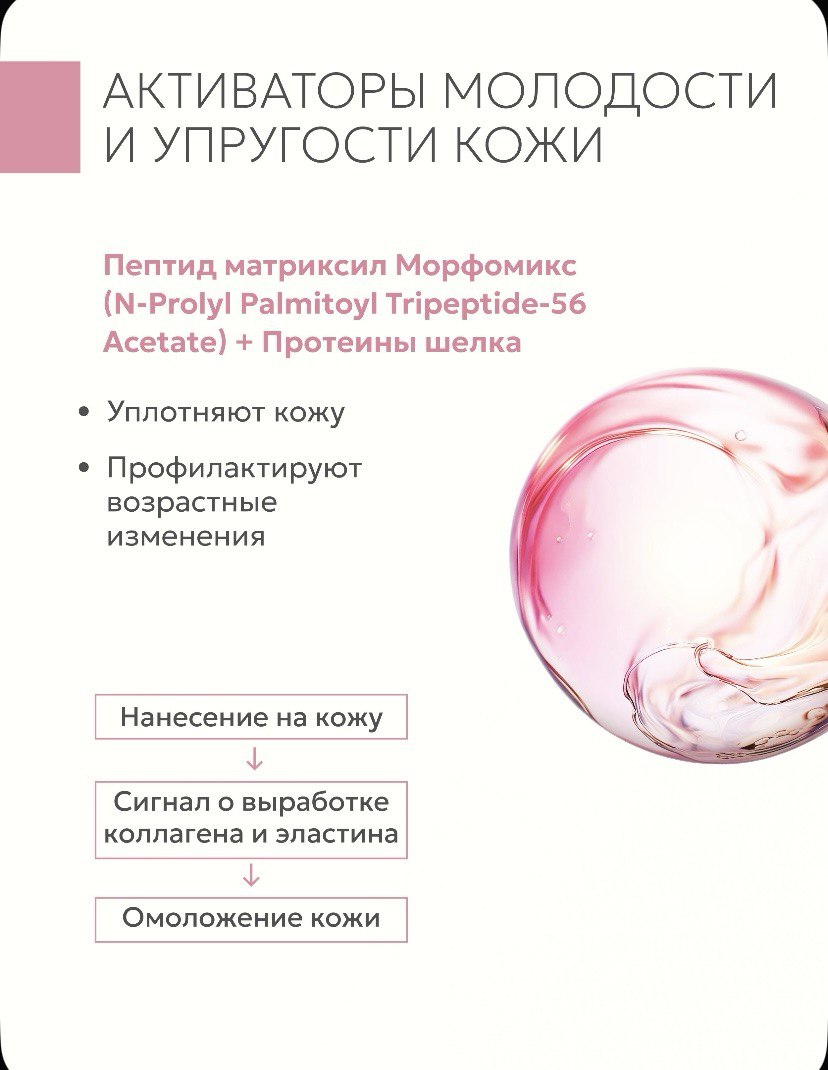 Сигнальный пептид матрикин (N-Prolyl Palmitoyl Tripeptide-56 Acetate) и протеины шёлка помогают повысить плотность и упругость кожи, уменьшают видимость морщин и замедляют появление новых. Гиалуроновая кислота удерживает влагу на поверхности кожи, масло сладкого миндаля укрепляет гидролипидный барьер, а сок алоэ вера и Д-пантенол успокаивают и способствуют восстановлению кожи при микроповреждениях. Формула крема содержит солнцезащитный фактор SPF 15, который защищает кожу от повреждений, вызванных УФ-излучением.