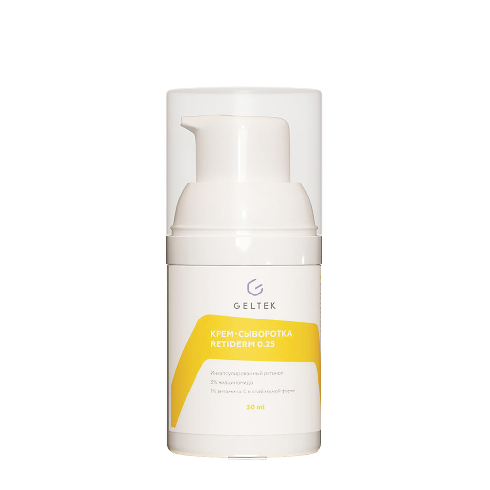 ГЕЛЬТЕК Retiderm 0.25 - это лёгкая, кремообразная сыворотка, содержащая 0,25% активного ретинола двух видов: свободного и инкапсулированного в липосомах. Крем-сыворотка эффективно борется с морщинами и другими признаками фото- и хроностарения, пигментацией, воспалениями, потерей эластичности, расширенными порами, выравнивает рельеф кожи и значительно улучшает цвет лица. Выверенное сочетание ингредиентов с доказанной anti-age эффективностью, таких как ретинол и ниацинамид, и мощных антиоксидантов (витаминов С и Е), а также пребиотических, питательных и интенсивно увлажняющих компонентов, позволило создать средство, обладающее способностью заставить возрастную кожу функционировать, как в молодости.