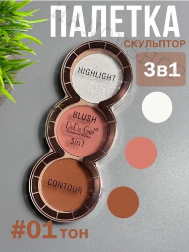 Хайлайтер, румяна, контуринг для лица – эти три волшебных продукта собраны в одной компактной палетке, что делает вашу косметичку легче и компактнее. Теперь вы сможете быстро и легко освежить свой образ в любой момент. Хайлайтер подарит вашей коже невероятное сияние, вы будете излучать внутренний свет, будто только что вернулись с отдыха на тропическом острове. Румяна для лица – придадут вашим щечкам нежный и естественный румянец, словно после прогулки на свежем воздухе. Ваш образ становится живым и невероятно привлекательным. Скульптор для лица - секрет идеального контуринга! Скульптор создает магические акценты на вашем лице, придавая утонченность. Вы сможете выделить скулы, создать контуринг носа, подчеркнуть подбородок, создать совершенные контуры для завершенного макияжа.​