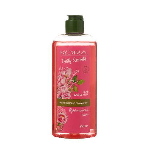 KORA ( КОРА ) Тонкий аромат цветущего пиона подарит романтическое настроение и нежность. Эфирное масло пальмарозы оказывает тонизирующее действие, снимает напряжение и стресс, возвращает коже упругость и гладкость. Ароматная пена геля бережно очищает кожу, оставляя ощущение легкости и свежести.