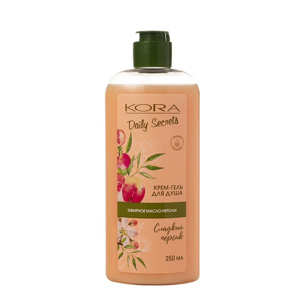 KORA ( КОРА ) Сладкий аромат свежего персика подарит вам ощущение лета. Эфирное масло нероли пробуждает положительные эмоции, способствует увлажнению кожи и восстановлению ее эластичности. Мягкая кремовая текстура геля для душа создает легкую пену, которая бережно очищает кожу, делает ее нежной и бархатистой.