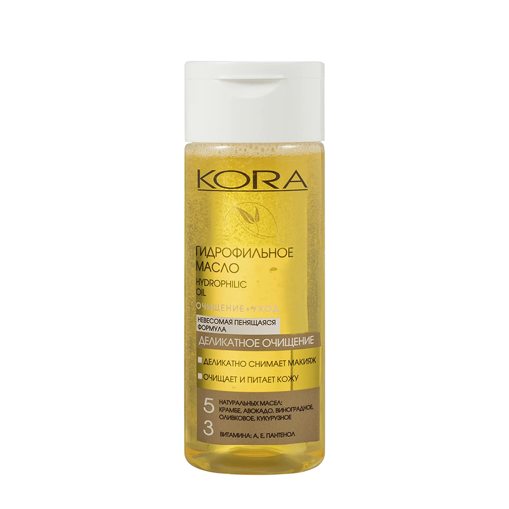 KORA ( КОРА ) Гидрофильное масло обеспечивает эффективное и бережное удаление макияжа и очищение кожи лица век и губ. При взаимодействии с водой масло превращается в нежную слегка пенящуюся эмульсию, которая легко растворяет и снимает даже стойкий макияж. Невесомая формула средства не нарушает водный баланс кожи, дарит ощущение чистоты и комфорта, придавая коже сияние и бархатистость.