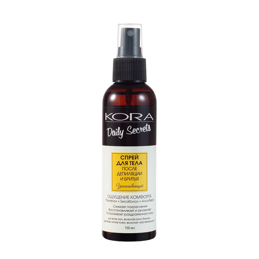 KORA ( КОРА ) Успокаивающий спрей разработан для максимальной заботы о вашей коже после депиляции и бритья. Нежная вуаль средства, благодаря специальному дозатору, равномерно распределяется по кожным покровам, даря чувство необыкновенного комфорта.