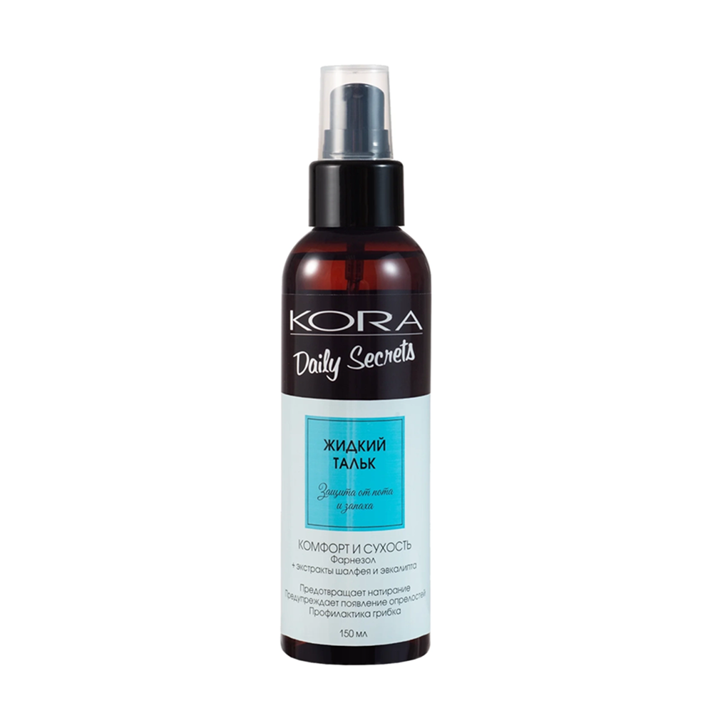 KORA ( КОРА ) Жидкий тальк с фарнезолом предназначен для ухода за кожей, склонной к повышенному потоотделению.