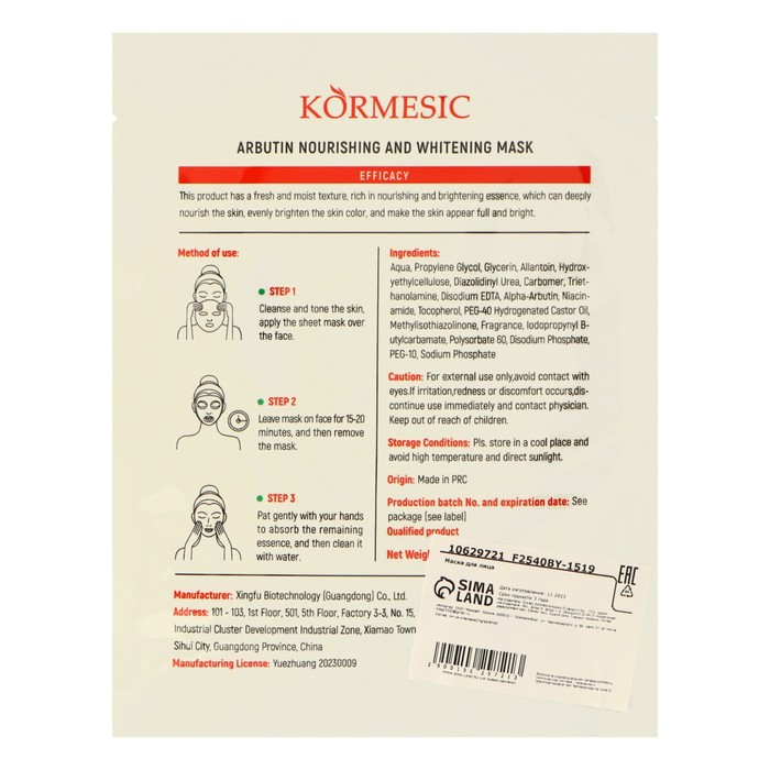 Способ применения: аккуратно расправьте маску и наложите её на лицо, плотно прижав к коже. Оставьте маску на 15-20 минут. Снимите маску и аккуратно помассируйте оставшуюся эссенцию до полного впитывания. При необходимости нанесите увлажняющий крем.