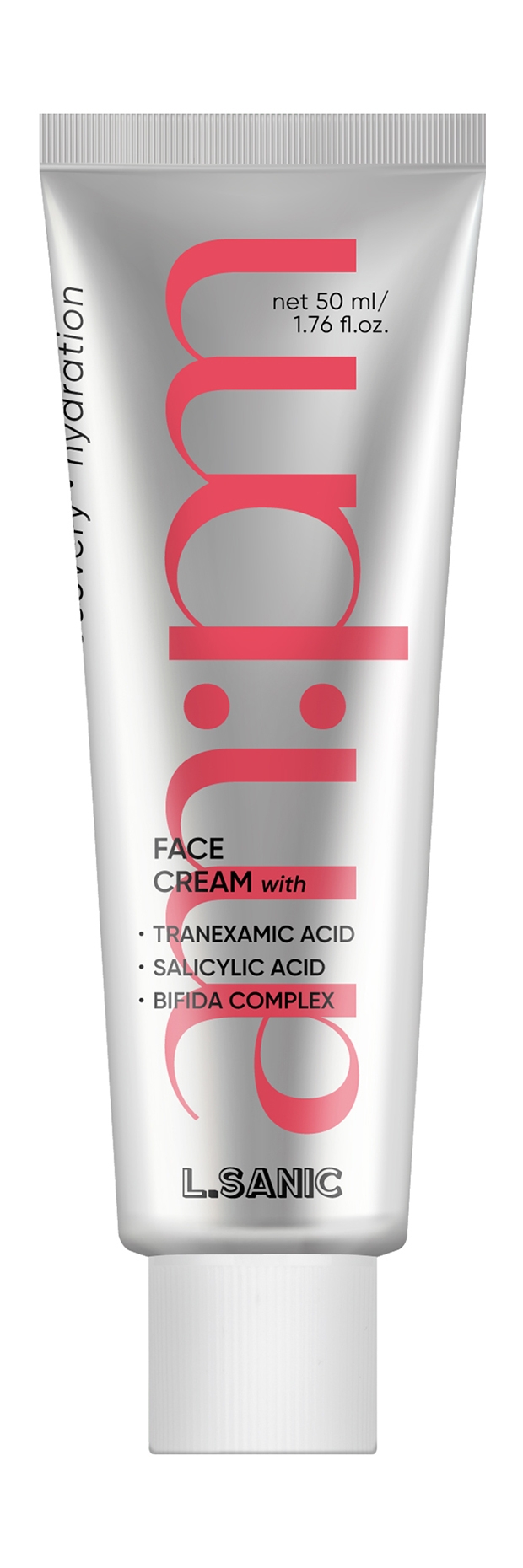 Water, Cetyl Ethylhexanoate, Glycerin, Butylene Glycol, Caprylic/Capric Triglyceride, Cetearyl Alcohol, Betaine, Propanediol, Glyceryl Stearate, PEG-100 Stearate, Polysorbate 60, Arginine, Carbomer, Caprylyl Glycol, Simmondsia Chinensis (Jojoba) Seed Oil, Olea Europaea (Olive) Fruit Oil, Persea Gratissima (Avocado) Oil, Ethylhexylglycerin, Xanthan Gum, Fragrance, 1,2-Hexanediol, Disodium EDTA, Sodium Hyaluronate, Vegetable Oil, Melia Azadirachta Leaf Extract, Melia Azadirachta Flower Extract, Bifida Ferment Filtrate, Lactobacillus Ferment, Lactobacillus Ferment Lysate, Coccinia Indica Fruit Extract, Salicylic Acid, Tranexamic Acid, Centella Asiatica Extract, Solanum Melongena (Eggplant) Fruit Extract, Aloe Barbadensis Flower Extract, Scutellaria Baicalensis Root Extract, Polygonum Cuspidatum Root Extract, Camellia Sinensis Leaf Extract, Corallina Officinalis Extract, Curcuma Longa (Turmeric) Root Extract, Ocimum Sanctum Leaf Extract, Rosmarinus Officinalis (Rosemary) Leaf Extract, Chamomilla Recutita (Matricaria) Flower Extract, Tocopherol, Ulmus Davidiana Root Extract, Pueraria Lobata Root Extract, Pinus Palustris Leaf Extract, Oenothera Biennis (Evening Primrose) Flower Extract, Dipotassium Glycyrrhizate.