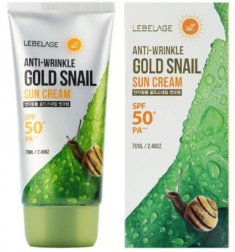 Солнцезащитный крем спф для лица с муцином улитки и золотом с фильтром SPF 50 + / PA+++ разработан для комплексного ухода от морщин: он появления признаков старения с помощью защиты от УФ лучей и для разглаживания уже имеющихся признаков старения. Санскрин для загара LEBELAGE Anti-Wrinkle Gold Snail Sun Cream SPF50+ PA+++, 70ml. защищает кожу от агрессивного воздействия солнечных лучей, обладает интенсивным увлажняющим, питательным разглаживающим эффектами. Он идеально подойдет как основа под макияж. Физические (минеральные) и химические (органические) фильтры предотвращают фотостарение, и как следствие появление морщин и пигментации. Муцин улитки запускает естественное производство коллагена, запускает процессы восстановления и регенерации, убирает шрамы, рубцы, а также разглаживает.